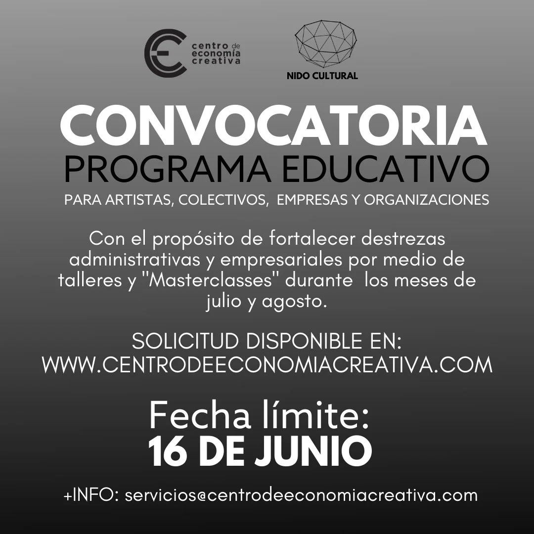 Esta convocatoria va dirigida a artistas, empresas y organizaciones con interés en fortalecer destrezas administrativas y empresariales por medio de talleres y "Masterclasses" durante los meses de julio y agosto. Los proyectos pueden estar en cualquier etapa. La convocatoria estará abierta hasta el jueves, 16 de junio. El programa comienza el miércoles, 29 de junio; serán hasta un máximo de 30 horas contacto de forma virtual en sesiones durante la semana en horario de 6:30 pm.